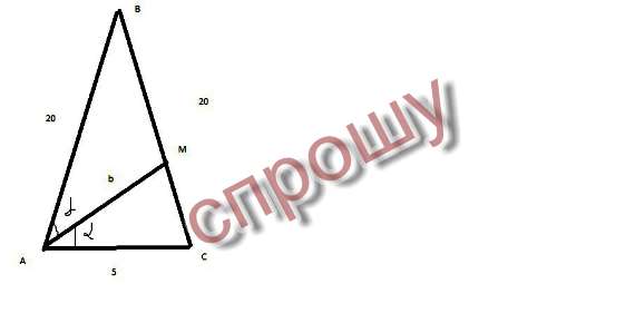 В равнобедренном треугольнике основа = 5 см, боковая сторона = 20 см. Найти биссектрису треугольника, проведенную к боковой стороне.