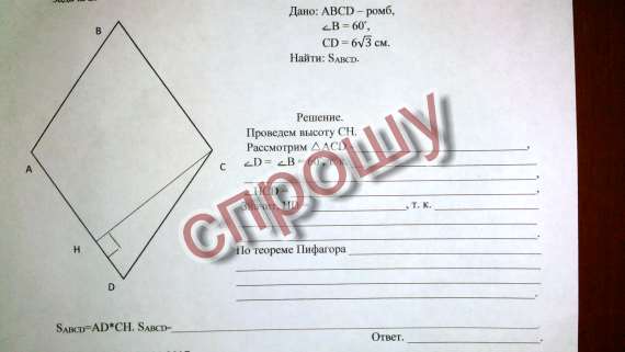 Проведем высоту СН. Рассмотрим треугольник НСД. В нем угол Д=60 градусов (противоположные углы ромба равны). Данный треугольник прямоугольный (СН - высота).Тогда угол НСД=90-60=30 гр. По теореме катет, лежащий против угла в 30 гр. = половине гипотенузы. Значит НД=6корней из 3:2=3корня из 3. По теореме Пифагора найдем катет СН. СН в квадрате =6корней из 3 в квадрате - 3корняиз 3 в квадрате = 81. СН=9