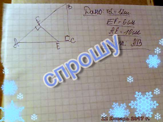 Поскольку треугольники АFE и ACB подобны, то их соответствующие стороны пропорциональны коэффициент подобия равен k=BC/EF=12/6=2, таким образом AB=k*AE=2*10=20 см