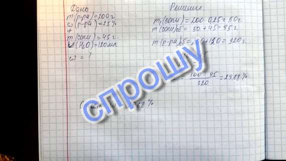 В 200 г 25 % раствора соли добавили еще 45 г соли и 120 мл воды. Какой стала ω (омега) ?