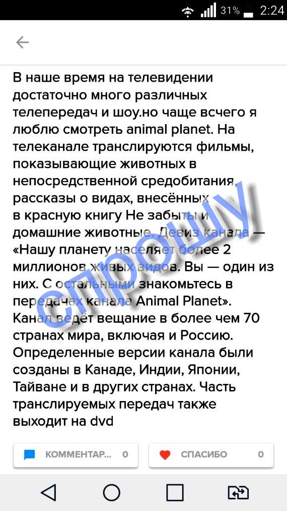 Биздің уақытта теледидарда жеткилектей әртүрлі бағдарлама, шоу коп. Бірақ мен жиі animal planet көремін. осы каналда калай жануарлар айдалада тұратын ,кызыл кітапқа кірген туралы көрсетеді . және уй жануарлары ұмытылган жок. Каналдың ұраны- биздин жеримизде еки миллион тири жәдиктер тұрады. Сиз -соның биреуине жатасыз. калганымен animal planet каналында танысасыз. осы каналды жетпіс қалада көрсетеді, Россияны да қос са.каналдын басқа версияларын Канадада, японияда, Үндістанда жасалган .калгандар жарнамалар dvd да шығады