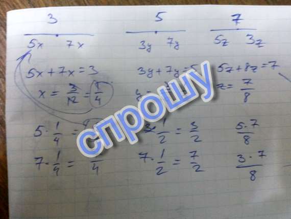 Отрезок длиной 3 разделили на две части, которые соотносятся как 5:7. Отрезок длиной 5 разделили на две части, которые соотносятся как 3:7. А отрезок 7 разделили на две части, которые соотносятся как 5:3. Найдите длину каждого из шести получившихся отрезков.