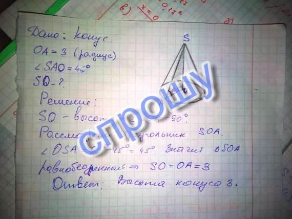 Имеем прямоугольный треугольник АОS со сторонами АО=R=3, OS - высота, угол SAO=45град.
