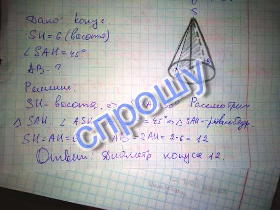 Высота конуса равна 6, образующая наклонена у плоскости основания под углом 45 градусов. Найдите диаметр конуса.