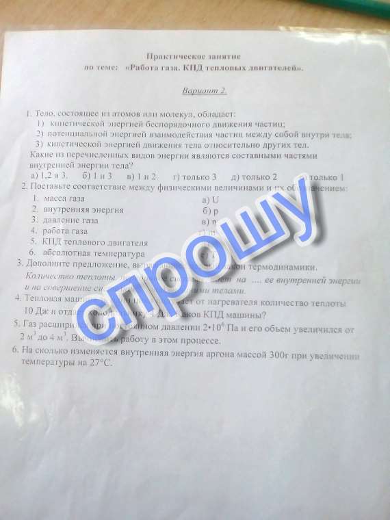 6 - ΔU(изменение внутренней энергии) = (3*v*R*ΔT)/2. v(ню, кол-во аргона) = 0.04 кг/моль, R = 8.31, ΔT = 27. Подставляем в формулу значения и находим ΔU = (3*0.04*8.31*27)/2 = 13.4622 Дж