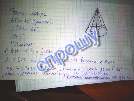 Диаметр основания конуса равен 10. Образующая конуса наклонена к плоскости основания под углом 60 градусов. Найдите образующую конуса.