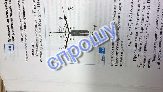 Определите модуль силы натяжения легкого троса , на котором висит светофор массой m = 20 кг , если угол между вертикалью и каждой часью троса равен a/2 = 45 градусов