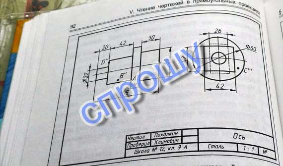 Ось; сталь; масштаб 1:1; 2- вид спереди и вид слева; 4 геометрических тела; цилиндр (диаметр 22 мм высота 20мм), куб ( с ребром равный 42 мм), цилиндр ( диаметр 60мм высота 13мм), прямоугольный параллелепипед (длина 50мм,, ширина 26мм, высота 30мм)