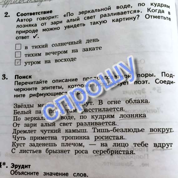 Эпитеты: белый пар,зеркальная вода,кудри лозняка,алый свет,чуткий камыш,роса серебристая .