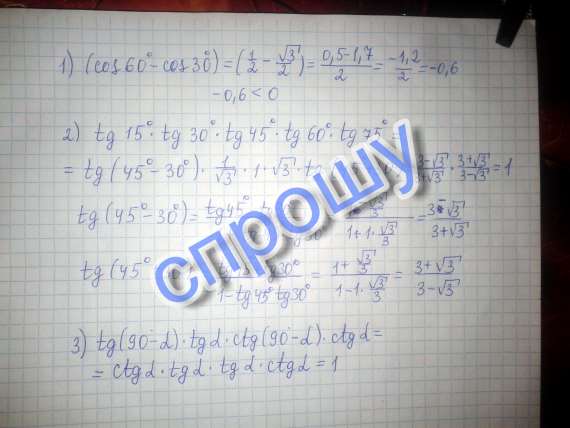 Первое:Определите знак выражения:(cos60градусов-cos30градусов)Ответ:Меньше нуля