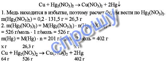Медную пластину массой 100 г опустили в 131,5 г 20%-ного раствора нитрата ртути Hg2(No3)2. Какова будет масса пластины после окончания реакции