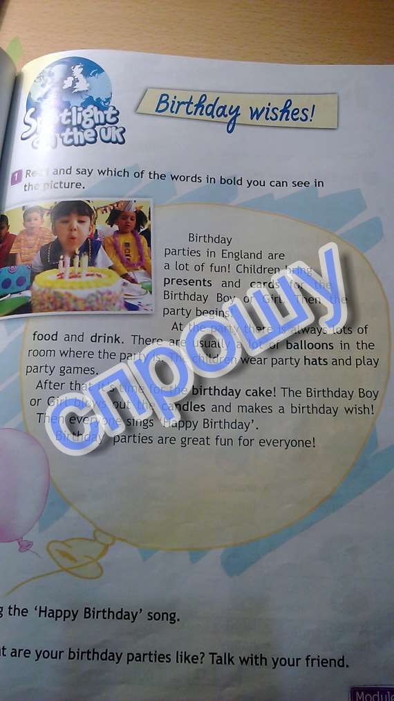 День рождения партии в Англии много веселья! Дети приносят подарки и открытки на день рождения мальчика или девочки. Тогда вечеринка начинается! На вечеринке всегда много еды и питья. Есть, как правило, много воздушных шаров в помещении, где партия находится. Дети носят партийные шляпы и партийные игры. После этого пришло время для торта ко дню рождения! День рождения Мальчик или девочка задувает свечи и делает с днем рождения! Тогда все поют "С днем рождения. День рождения партии большое удовольствие для всех!