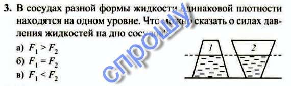 F₁=F₂ т.к. сила давления не зависит от формы сосуда, потому что высота жидкости в 1-м и 2-м сосуде одна и та же.