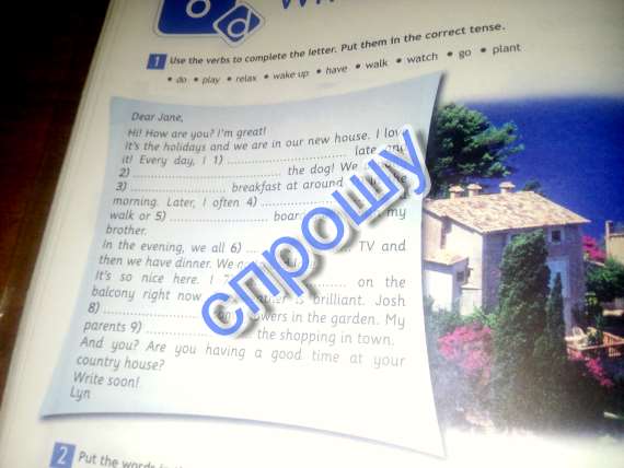 В 1 - wake up 2-walk 3- have 4-go 5- play 6- watch 7- reiaxing 8- is planting 9-are doing