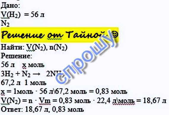 Какой объём и количество вещества азота (моль) израсходуется при взаимодействии с водородом объёмом 56 л?