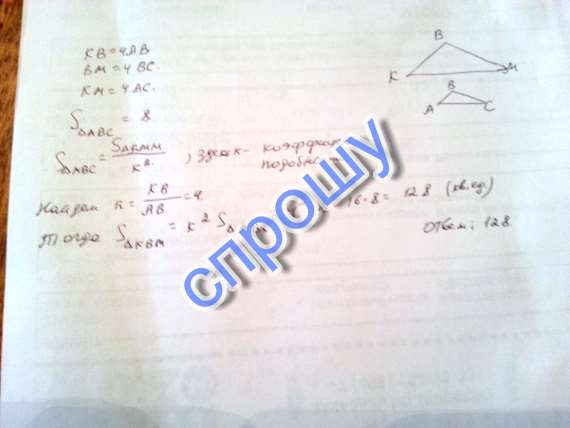 Треугольники АВС и КВМ подобны, стороны треугольника КВМ в 4 раза больше сторон треугольника АВС. Площадь треугольника АВС равна 8. Найдите площадь треугольника КВМ.