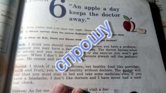 Стивен:Как по мне,я считаю,что нужно иногда посещать доктора.Если произошел несчастный случай(ты сломал ногу)тебе нужно набрать номер 999.Когда у тебя болит голова,ты можешь выпить немного чая.Тебе нужно делать упражнения,есть хорошую пищу,тогда тебе будет не нужно посещать доктора очень часто,но нужно проходить медицинскую проверку каждый год.У меня была такая в этом месяце и у моей сестры Сью тоже.Сейчас я знаю,что мы здоровы.