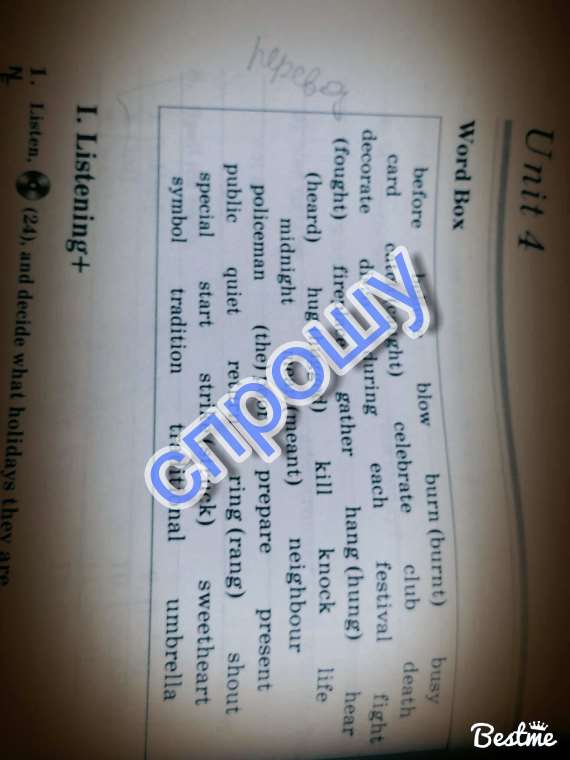 Перед(чем-то), верить(доверять), дуть(про ветер), сгорать(сжигать), занятой(оживлённый), карта(кредитная), ловить(поймать), праздновать(отмечать), клуб, смерть, украсить(тут я сомневаюсь), диско, во время, each, фестиваль, битва(биться, сражаться), fireplace, gather, hang(hung), слышать(услышал), обнять(обнял), убить, постучать(в дверь), жизнь, полночь, иметь в виду(имел в виду), сосед, полицейский, бедный(о деньгах), чинить, подарок, публика.