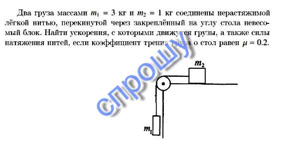 a=g*(m1-μ*m2)/(m1+m2)=10*(3-0.2*1)/(3+1)=7 м/с^2