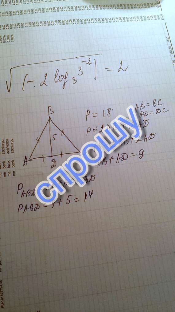 Дан равнобедренный треугольник ABC с основой АС, в нем проведена медиана ВD = 5 см, найти периметр треугольника ABD если периметр ABC = 18cм