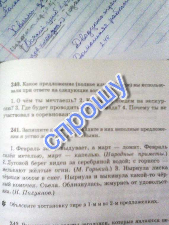 Номер 240 придумать к каждому вопросу полное и неполное предложение . Помогите пожалуйста.