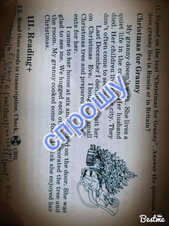 Моя бабушка не работает. она живёт спокойной жизнью в стране. её муж умер. её дети живут в городе. они не часто приходят что бы увидеть её. в декабре прошлого года я решил посетить её в канун рождества. я купил маленькую ёлкуи подготовил несколько подарков для неё. я пришел к ней домой в 6 часов и постучал в дверь. она была рада меня видеть. мы обняли друг друга. я украсил ёлку и комнату. моя бабушка приготовила еду. я думаю что она полюбила рождество