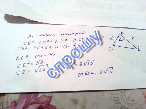 В треугольнике ске найдите сторону се если ск = 6 ке = 8 к = 60