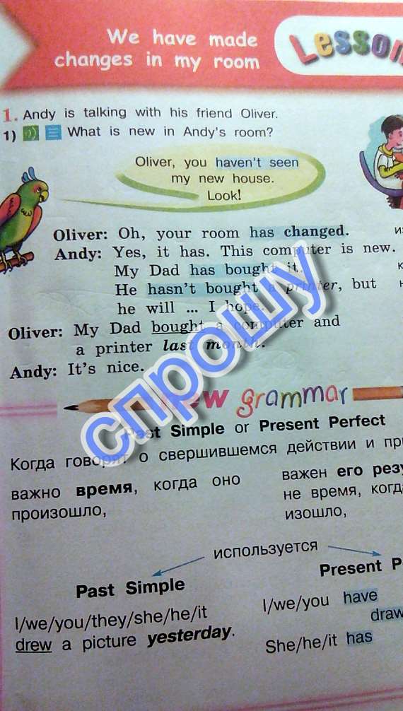 Олив.:Мой папа купил компьтер с принтером в прошлом месяце.