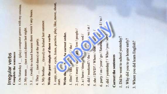 1) 1. played. 2. didnt cook. 3. walked. 4. didnt dance. 5. travelled.2) copied, revised, cycled, listened, practised, played, liked, moved, shouted, started.3) 1. Did you like the film 2. How many people did you ask 3. Did they have a good time 4. What did we do at the weekend 5. Where did she buy that DVD 6. Did he go to your party on Saturday 7. Who did you see yesterday4) 1. Did he go to school yesterday 2. Why did you go home yearly 3. Where did you learn English 4. Did she work today 5. What did you do this yesterday 6. Did they phone you last night5) fly - flew use - used study - studied eat - ate make - made travel - travelled see - saw6) 1. had. 2. went. 3. swam. 4. ran. 5. met. 6. ate, drank. 7. slept, was.