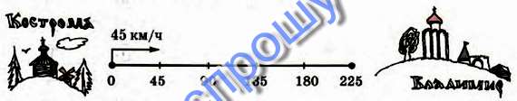 Определи по рисунку, из какого города выехал мотоциклист и с какой скоростью он едет? Изобрази его движение на числовом луче и определи, через сколько часов после выезда он прибудет во Владимир? На каком расстоянии от Костромы и от Владимира был мотоциклист через 3 ч после выезда?