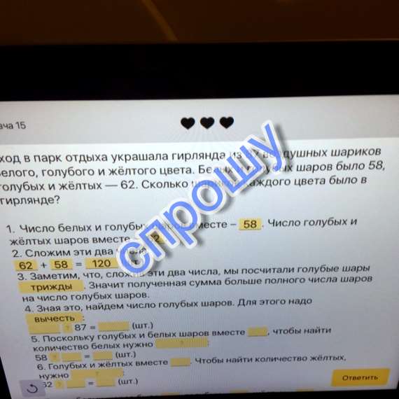 Вход в парк отдыха украшала гирлянда из 87 воздушных шариков белого голубого голубого и желтого цвета белых и голубых шаров было 58 голубых и желтых -62 сколько шариков каждого цвета было в гирлянде