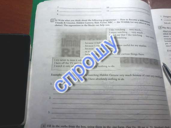 В этом задании тебе просто надо соединить предложения, твои предпочтения, что ты любишь смотреть по тв. и тебе даны программы: кто хочет стать миллионером умники и умницы, скрытая камера, фактор риска, BBC-дикая природа (или любая другая программа на твой выбор)