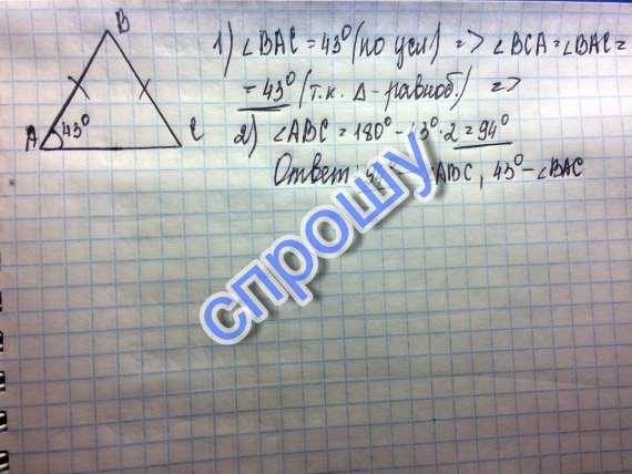 ABC-равнобедренный треугольник. при условии,что угол,прилежающий к осванию треугольника, равен 43градусов определите чему равны оставшиеся два угла