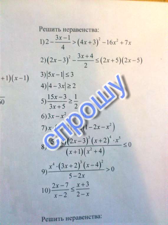 Наносим на числовую прямую нули числителя и знаменателя - точки 0; -2/3; 4; 5/2. Числовая прямая оказалась разбита этими точками на 5 промежутков. Нули знаменателя никогда не входят в ответ, нули числителя в этой задаче также не будут входить в ответ, так как неравенство строгое. Два множителя - (x-0) и (x-4) - входят в неравенство в четной степени, поэтому при переходе через точки 0 и 4 знак левой части не меняется. При переходе через две другие точки знак левой части меняется. Подставляя какой-нибудь x из самого правого промежутка (например, 1000), получаем "минус", так как со знаком минус x входит только в скобку 5-2x. Далее расставляем знаки, учитывая, что в точках 0 и 4 знак менять не надо.