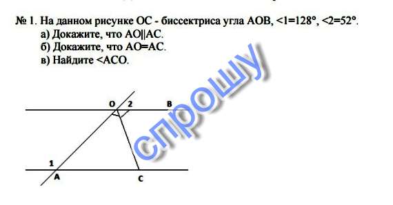 На данном рисунке ОС - биссектриса угла АОВ, <1 = 128°, <2 = 52°