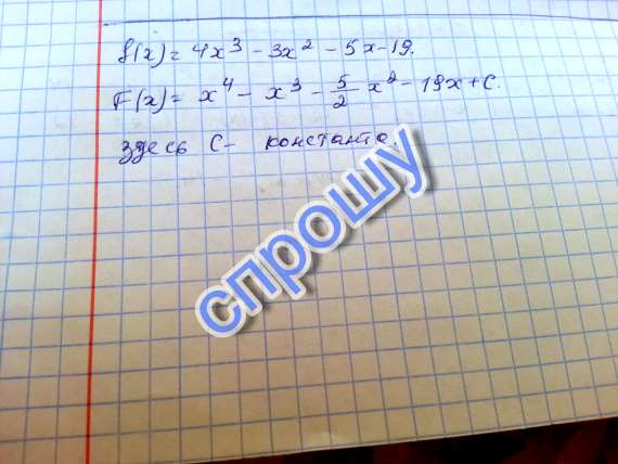 Найдите первообразную функции: Найдите первообразную для функции f(x) = 4х^3 - 3х^2 -5х-19