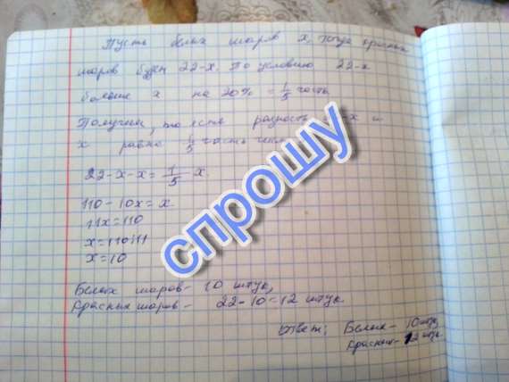 Количество красных шаров в урна на 20% больше чем кол-во белых шаров всего шаров 22 сколько красных и белых шаров в урне?