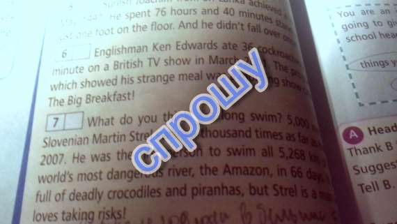 7. Что ты думаешь о долгом плаванье 5000 метров, словянский Мартин Стрел проплыл, тысячу раз, так далеко, в 2007 году. он был первым человеком, который проплыл, все 5268 км, по самой опасной в мире реке, Амазонка, за 66 дней. Она была полна ужасными крокодилами и пираньями, но Стрел - человек, любящий рисковать!