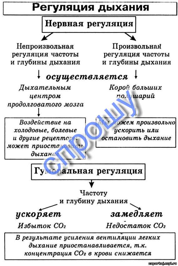 Гуморальная регуляция зависит от СО2: если в крови, которая омывает дыхательный центр, есть избыток СО2, возбудимость дыхательного центра растет и дыхание становится частым и глубоким; если СО2 в крови мало, то наоборот, вызывает торможение дыхания.