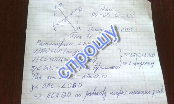 Отрезки AB и СDпересекаются в их середине O. Докажите что ac AC параллельно BD