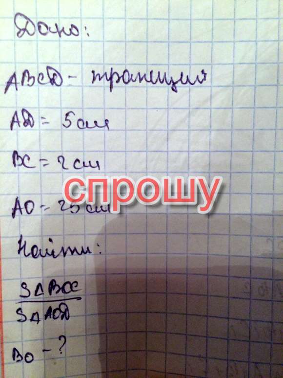 Треугольник ВОС подобен треугольнику АОД по 1 признаку( угол ВОС=углу АОД- вертикальные, угол СВО=углу АДО- накрест лежащие), Sвос/Sаод = к в квадрате= 4/25( к=2/5)