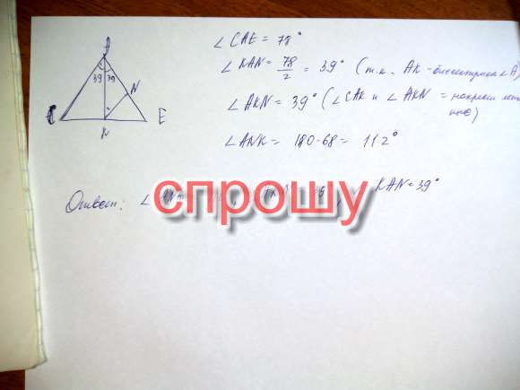 Отрезок АК - биссектриса треугольника САЕ. Через точку К проведена прямая, параллельная стороне СА и пересекающая сторону АЕ в точке N. Найдите углы треугольника АКN, если угол САЕ равен 78
