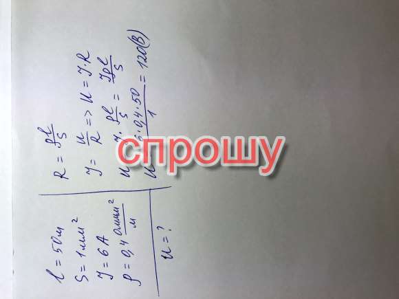 Обмотка реостата изготовлена из никелиновой проволоки длиной 50 м и сечением 1 мм². Ток в обмотке 6А. Определить напряжение.(удельное сопротивление никелина 0,4 ом*мм²/м)