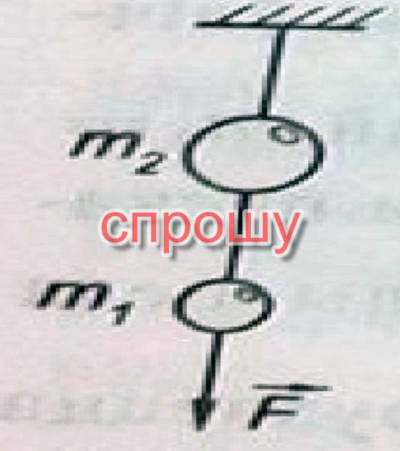 Два шарика массами m1 = 1 кг и m2 = 2 кг подвешены на нитке. Первый шарик тянут с силой F = 3 H. В какой то момент верхнюю нитку пережигают. Определите с каким ускорением начнут двигаться шарики, чему ровна сила натяжения, которая связывает их?