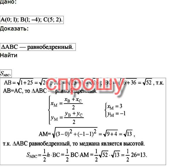 Вершины треугольника имеют координаты А(4;-2);В(-4;4);С(-12;10). Помогите доказать, что треугольник АВС равнобедренный