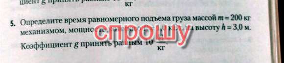 Правильный ответ будет 6 секунд. Формула мощности для равн. движ . N=F*V ⇒ N(мощность)= m*g*V. находим скорость и потом находим время через скорость v= S/ t; s=3 по условию. Только одно меня смущает, что коэффициент g равен 10 Н/кг.... Н/кг!!!What...
