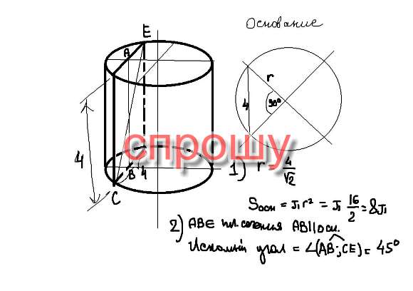 Сечение цилиндра,имеющее форму квадрата , параллельно его оси и отсекает от окружности дугу в 90 градусов. Площадь сечения равна 16 кв.см . Найдите : а) площадь основания цилиндра; б) угол между диагональю сечения и осью цилиндра