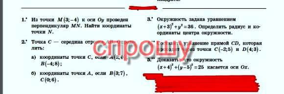 Координата т.N(0;-4) 1 зад. 2 зад.( 2+(-4))\2= -2\2 =-1 (0+8)\2=4 С(-1:4) б) ( х+3)\2=0 х+3=0 х=-3 (у+7)\2=6 у+7=12 у= 5 А(-3:5) 3 зад. радиус окр.равен 6 коорд.центра (-3:0)