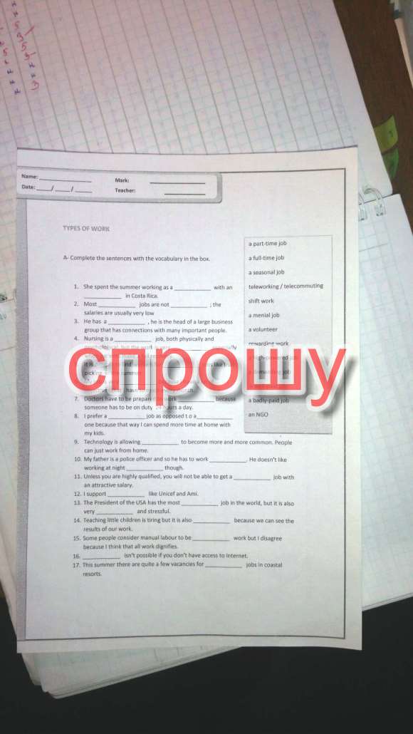 1 volunteer with an ngo 2 menial job well paid job 3 well-paid job 4 demanding job well paid job 5 seasonal job 6 high powered стальное незнаю