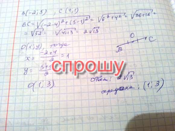 Найдите длину отрезка ВС и координаты его середины,если В(-2;5) и С(4;1)